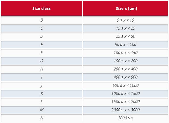 This letter is followed by codes for different particle size classes – from 5 µm to over 3000 µm. The letters B to N are often used for this purpose, although they do not represent normative standards. Particles from 5 µm to less than 15 µm, for example, correspond to size class B, particles larger than 3000 µm to size class N.