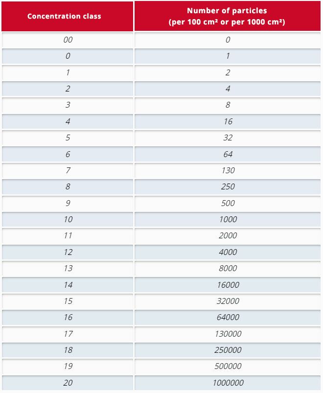 - The numbers after the letters, such as B10, C8 or D6, are coded values that indicate certain particle count ranges (concentration classes). The list shows the permissible or actual particle counts for the first four size classes